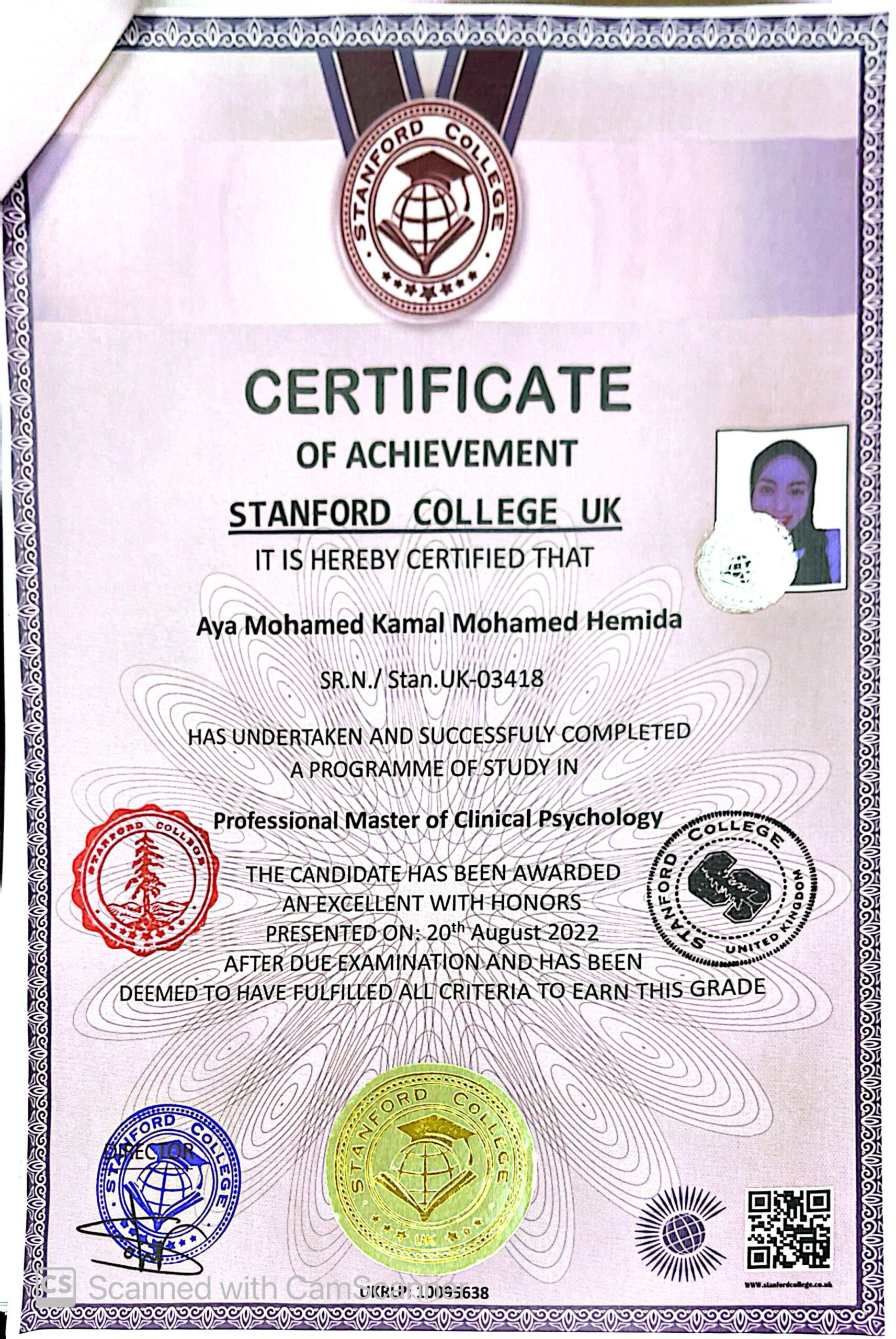 Aya Mohamed Kamal Mohamed Hemida SR.N./ Stan.UK-03418