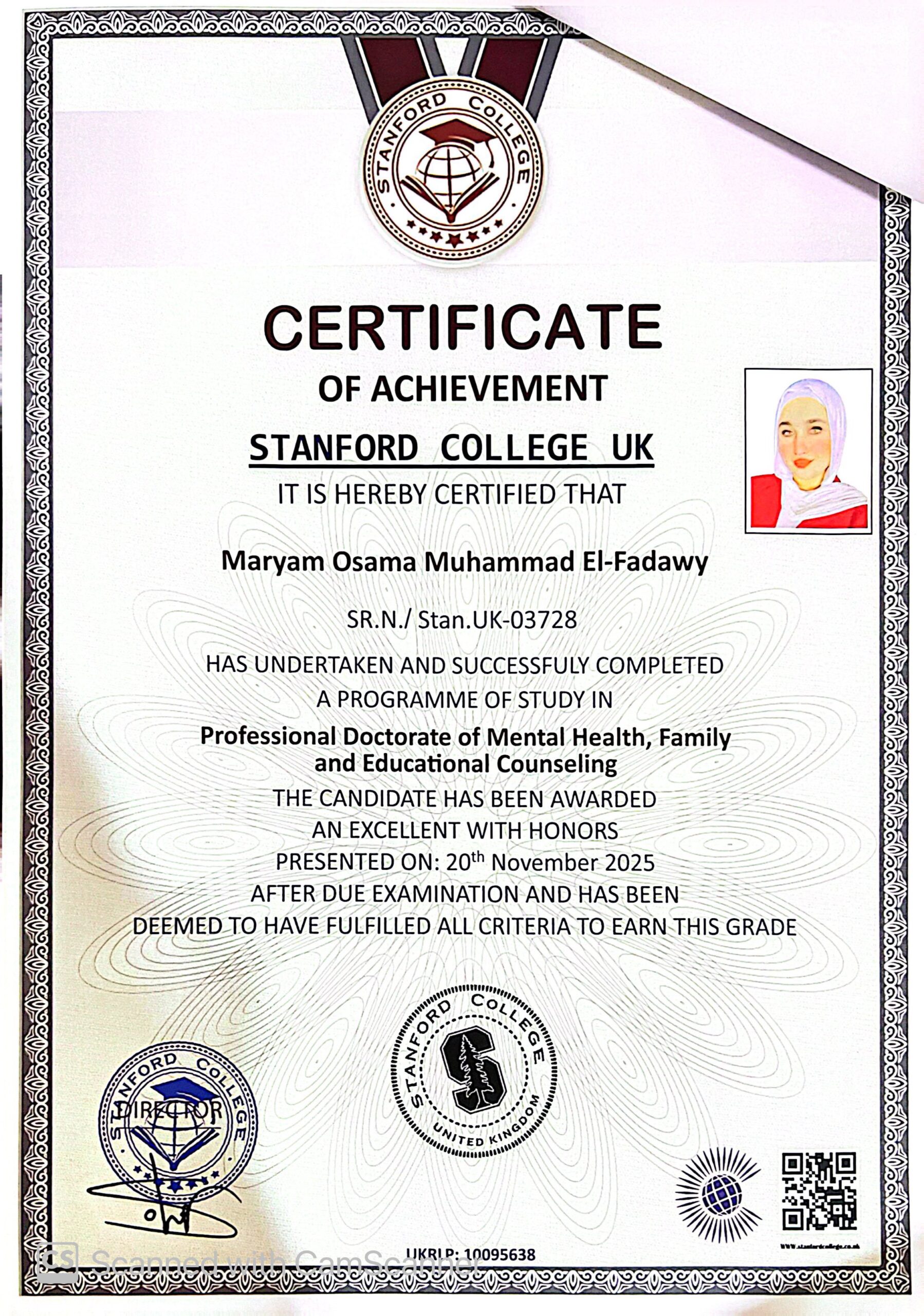 Maryam Osama Muhammad El-Fadawy SR.N./ Stan.UK-03728